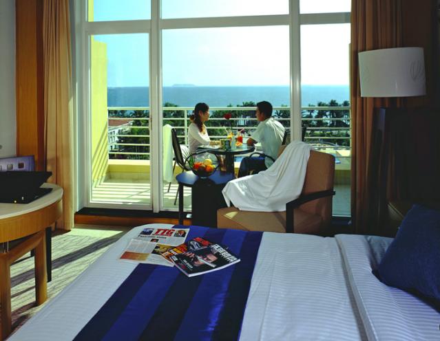 高級海景房,面積42平方米,樓層3-4層,有陽臺,180度海景,前面有遮擋物,大床(1.8*2米),雙床(1.2*2米),有浴缸,免費寬帶