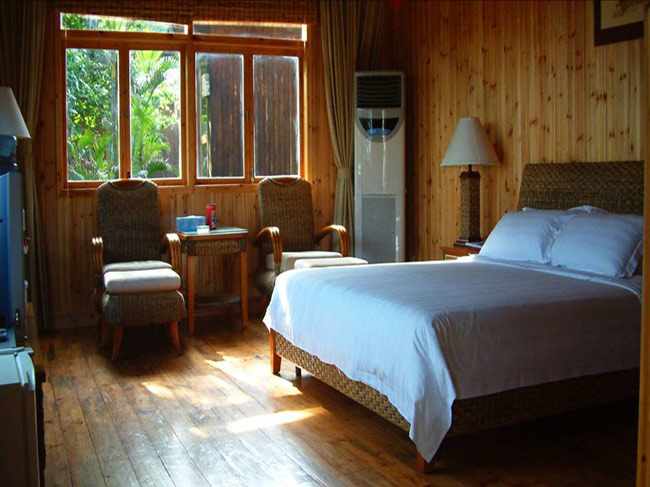 三亞蜈支洲島度假中心屬熱帶海洋性氣候,全年溫和氣爽,四季怡人。由于小島地處三亞海棠灣,避開(kāi)了臺(tái)風(fēng)走廊,所以不同于一般只能生長(zhǎng)灌木的北部小島,這里喬木高大挺拔,灌木繁茂葳蕤,如天然織就的一塊厚重的綠毯披在島上,麗質(zhì)天成。小島地貌美麗而有層次:島的中部坡地逶迤,起伏平緩,草木紛亂,藤蔓纏結(jié),花紫果綠,蟬噪鳥(niǎo)鳴。西部及北部平緩延伸入海,形成一彎路玉帶狀的銀色沙灘,沙質(zhì)均勻細(xì)膩,色澤潔白如雪,海水由淺入深,顏色由透明而碧綠繼而淺藍(lán),后而深藍(lán),明麗動(dòng)人層次分明。東部與南部則是現(xiàn)兩峰相連,最高峰海拔79.9米,其氣勢(shì)與洶涌仄相向,懸崖壁立如削,人跡難至,其下礁石林立,奇形萬(wàn)狀,驚濤拍岸,泡沫如雪。大風(fēng)或大潮時(shí),海浪咆哮奔騰激起的浪花可高達(dá)十米,形成獨(dú)特的山海奇觀。小島現(xiàn)已被開(kāi)發(fā)了三分之一,都位于西北部。建設(shè)者獨(dú)具匠心,巧妙地利用了地形地貌,使人工設(shè)施掩映期間,不減其風(fēng)采,反增其情趣。這里椰影婆娑,綠草成蔭,竹制建筑娉婷綽約,泳池碧波蕩漾。草地上小徑蜿蜒,點(diǎn)綴些秋千、蹺蹺板、石凳、竹制躺椅,編就了一幅世外天堂的畫(huà)面。